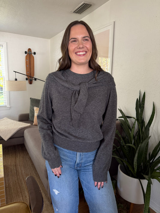 Miou Muse Athena Tie Drape Long Sleeve Sweater (Grey)