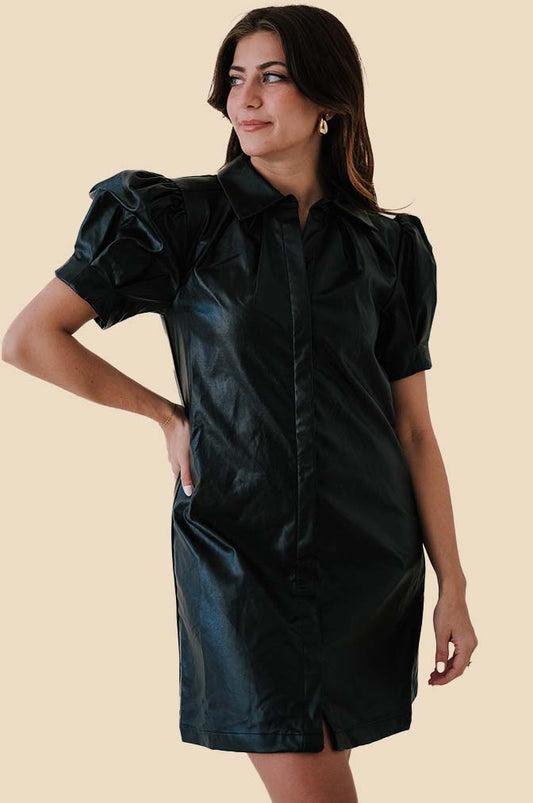 Aureum Tessa Vegan Leather Collared Mini Dress (Black)