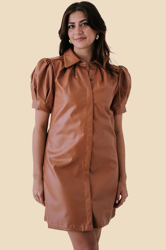 Aureum Tessa Vegan Leather Collared Mini Dress (Brown)