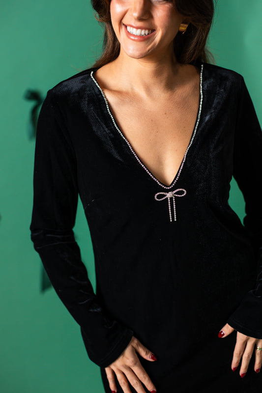 Lucy Paris Izumi Black Velvet Rhinestone Bow Mini Dress