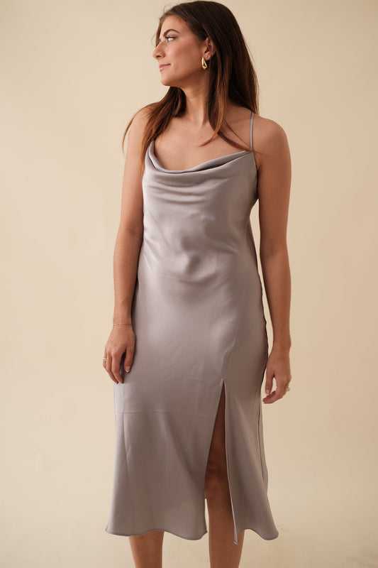 Lucy Paris Maya Slate Grey Satin Slip Midi Dress