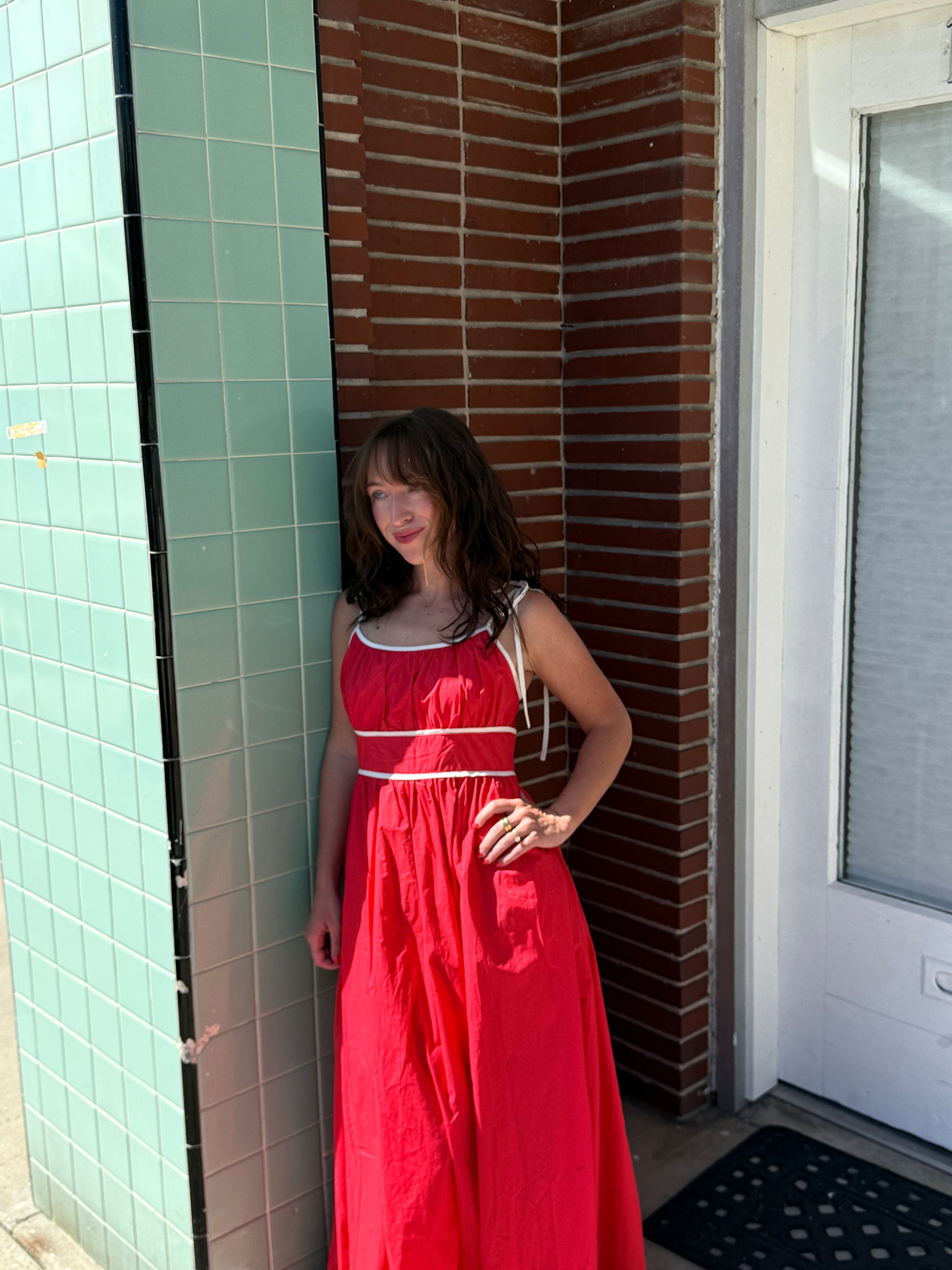 PINCH Kacie Red and Cream Cotton Tie Strap Maxi Dress