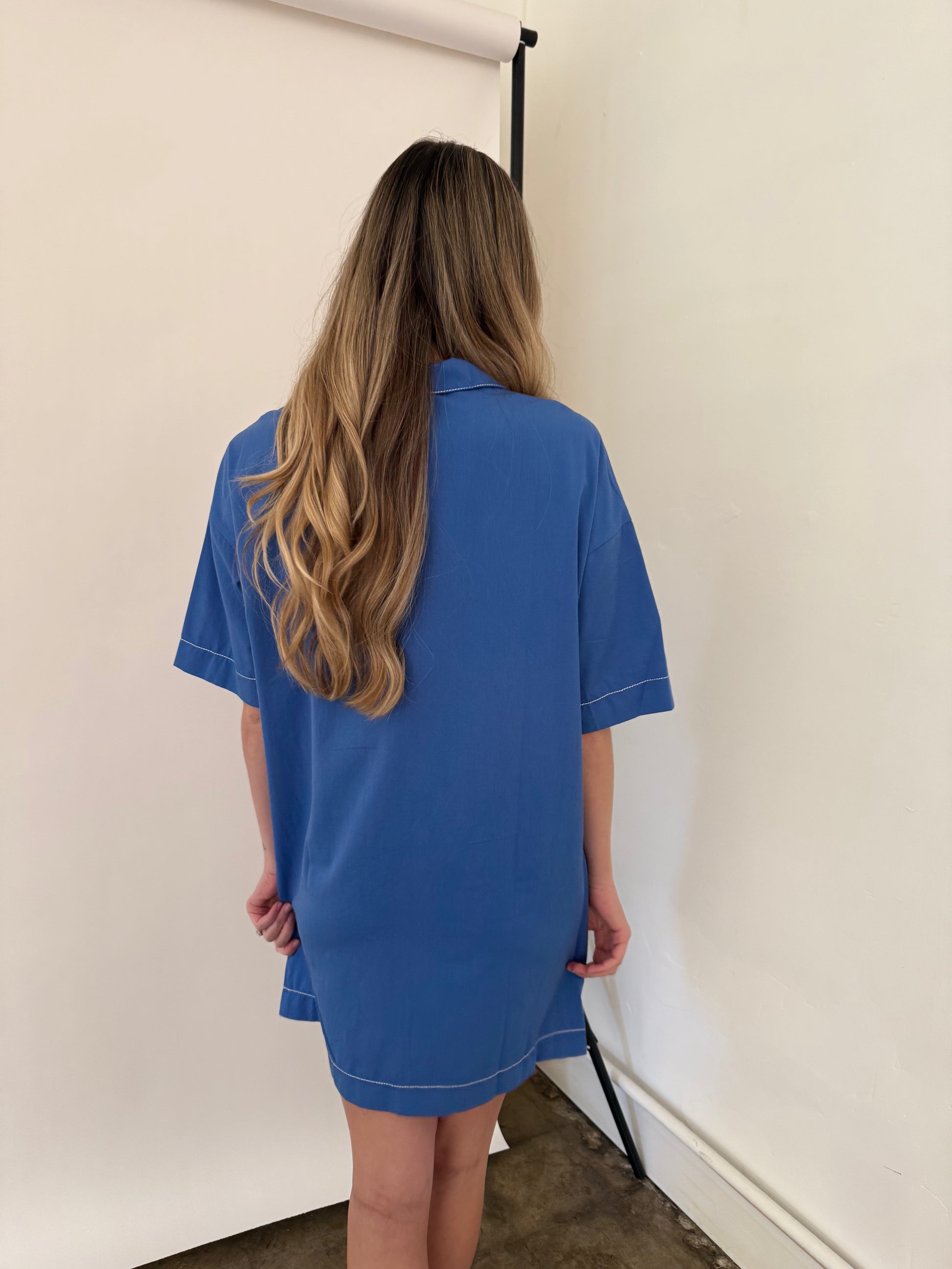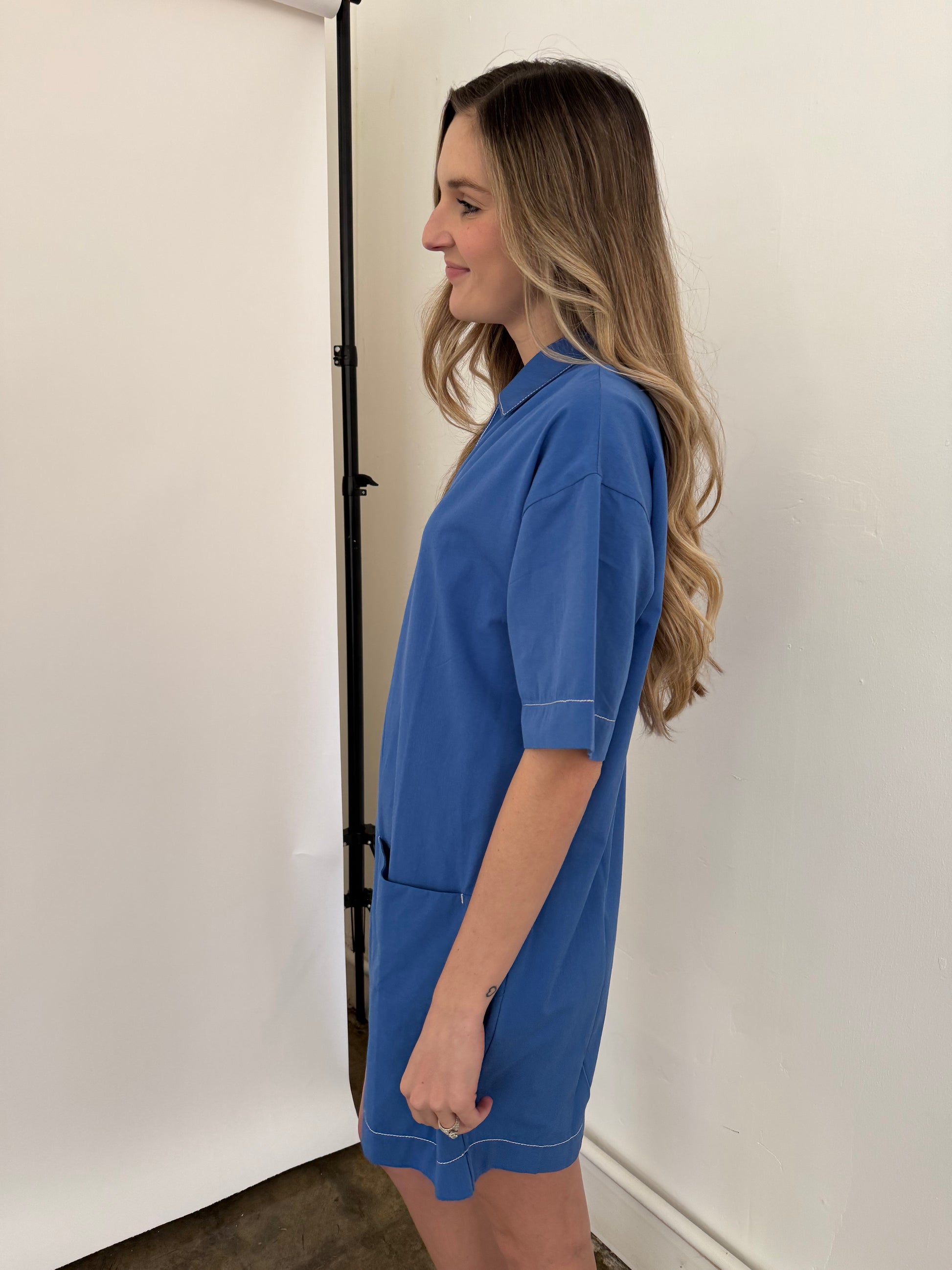 Blue collared mini dress from PINCH with white contrast stitching. Collared split v-neckline. Short sleeves. Double front hem pockets. Light stretch fabric.