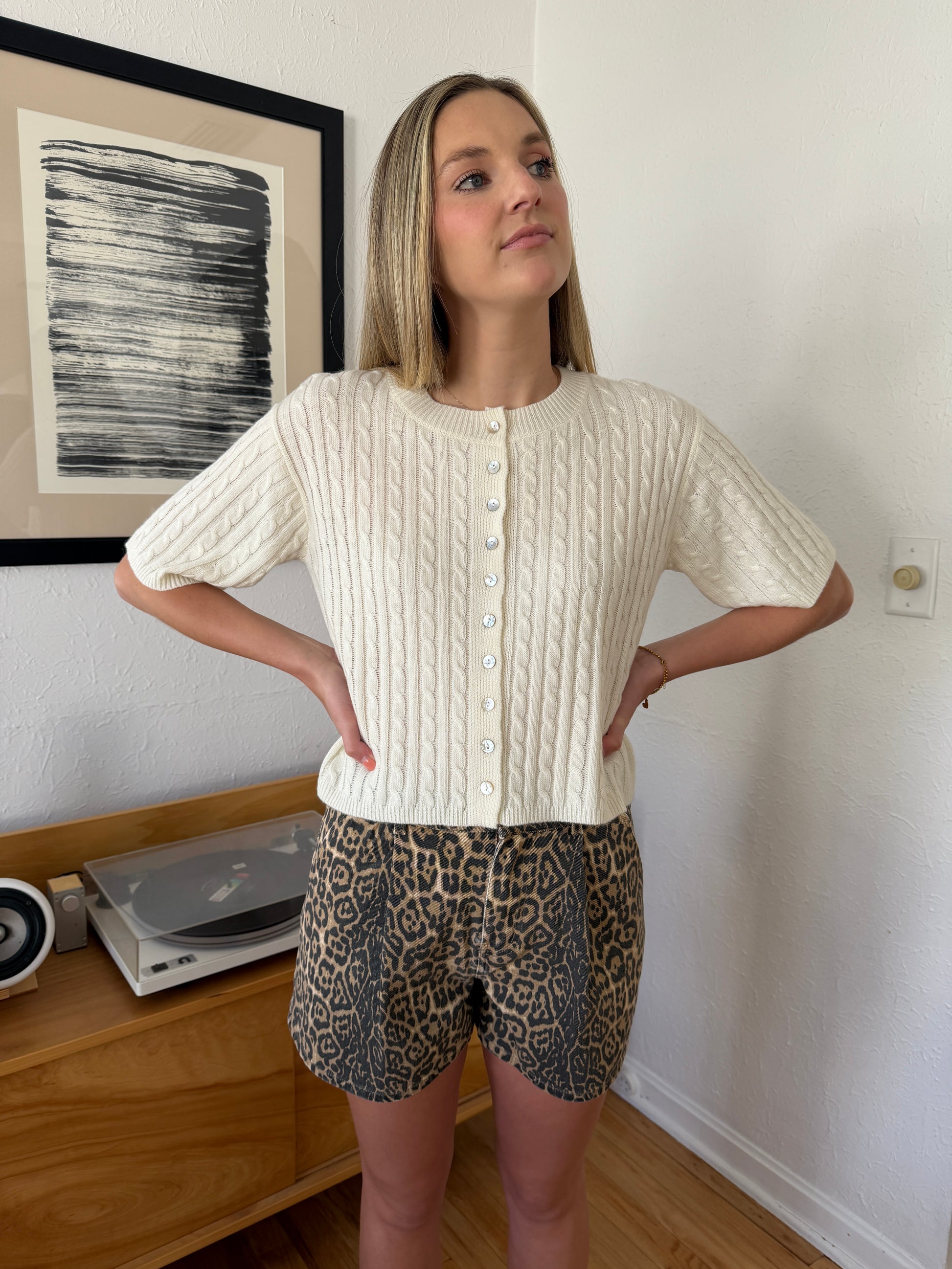 Leopard denim shorts from Things Between. Buttoned waistband. Side and back pockets. Front pleating. Relaxed fit.