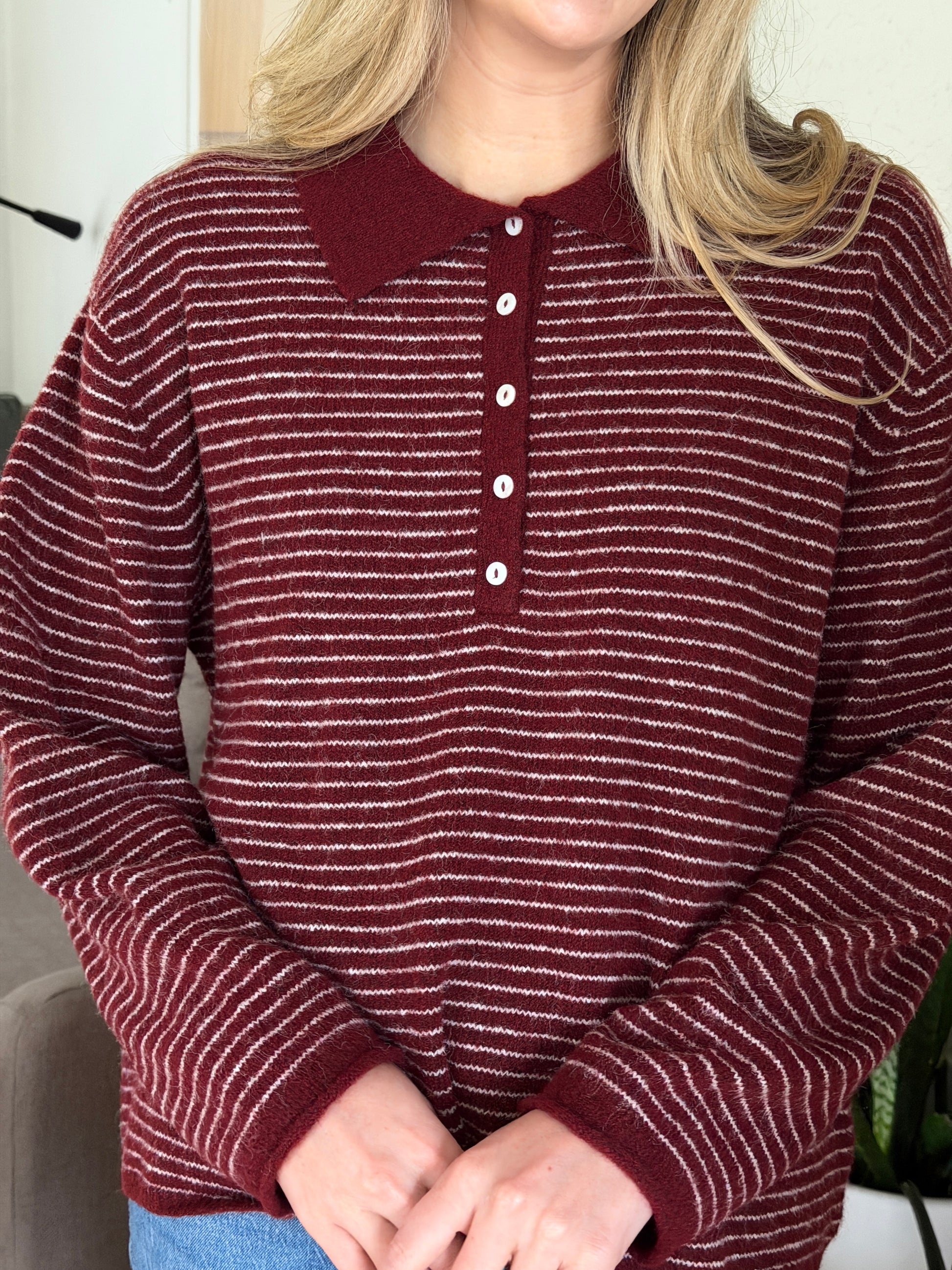 Burgundy and white striped polo rugby sweater top from Things Between. Collared split v-neckline with button detail. Long sleeves. Relaxed fit.