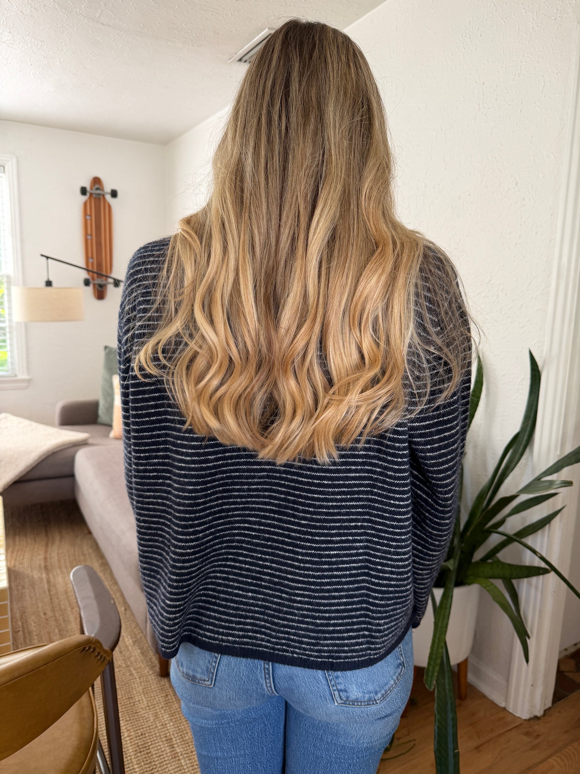 Navy and white striped polo rugby sweater top from Things Between. Collared split v-neckline with button detail. Long sleeves. Relaxed fit.