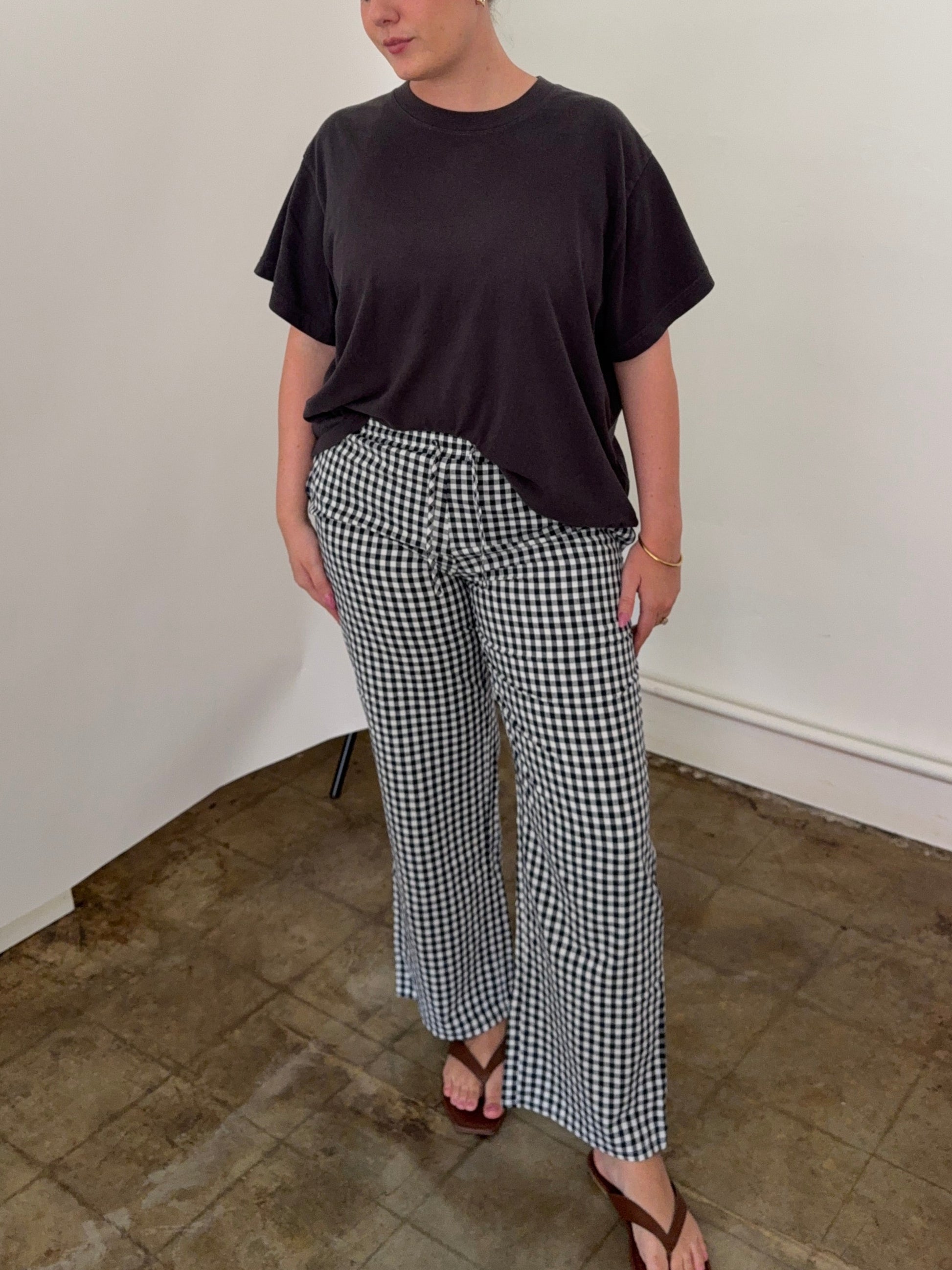 Gingham cotton relaxed pants from Things Between. Drawstring elastic stretch waistband. Side pockets. Relaxed fit.
